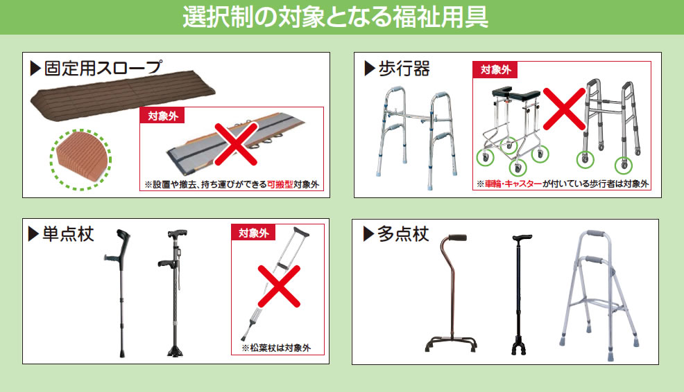 ※固定スロープ・歩行器(歩行車を除く)・単点杖(松葉づえを除く)・多点杖は「貸与」か「販売」の選択が可能な商品です。